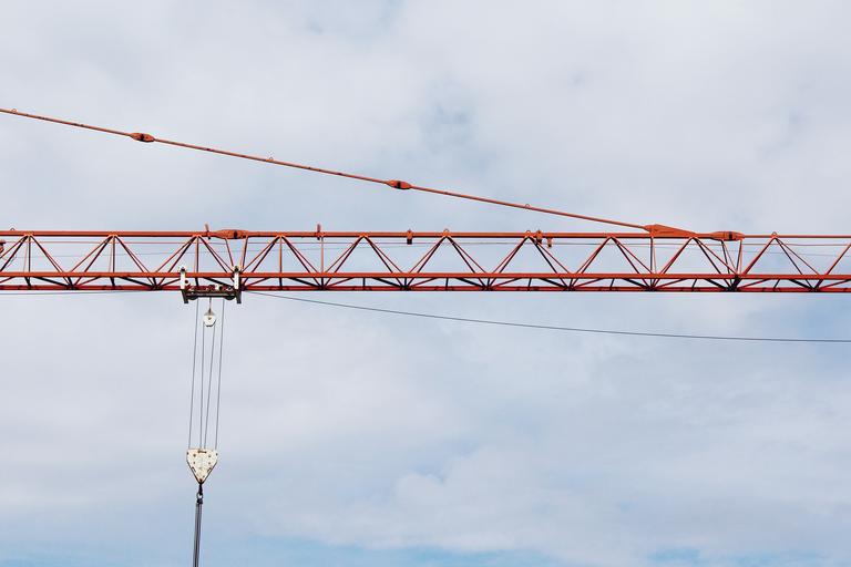 Keywords: crane baukran scaffold site technology construction work load lifter build crane arm red load rope sky clouds blue