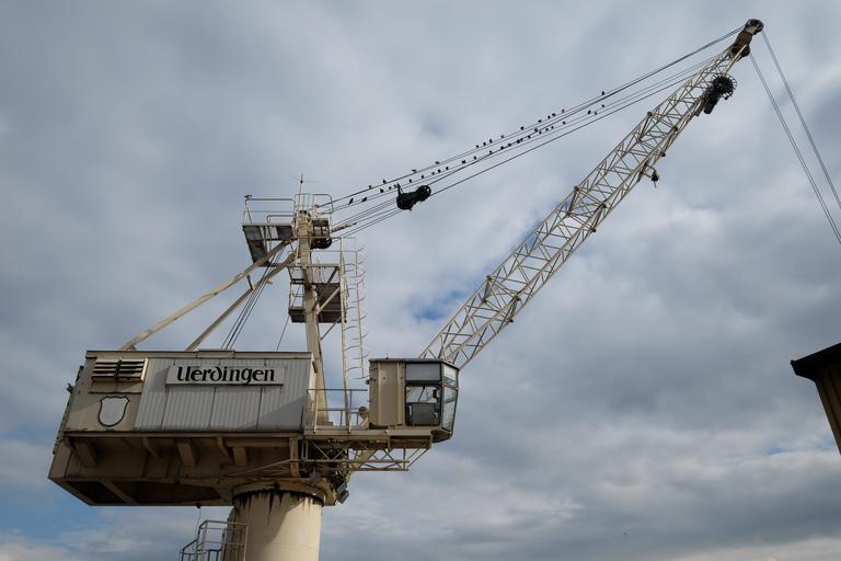 Keywords: crane port krefeld uerdingen harbour crane industry loading crane clouds inland port antique sky