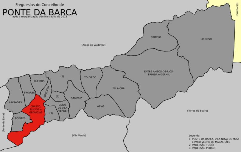 | Keywords: Crasto, Ruivos e Grovelas (Ponte da Barca) localização.svg pt Localização da União das Freguesias de Crasto Ruivos e Grovelas no concelho de Ponte da Barca Portugal en Location of the Union of Civil Parishes of Crasto Ruivos and Grovelas do Rio within the municipality of Ponte da Barca Portugal 2013-11-09 04 07 01 File Ponte da Barca freguesias 2013 svg Gazilion cc-zero Uploaded with UploadWizard Ponte da Barca SVG maps of freguesias in Portugal | ||||