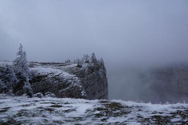 Keywords: creux du van mountains abyss switzerland cliff fog white trees jura winter