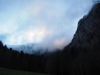 Keywords: creux du van swiss jura noiraigue ausräumungskessel rock fog mystical mountain range ridge jura hiking area abendstimmung
