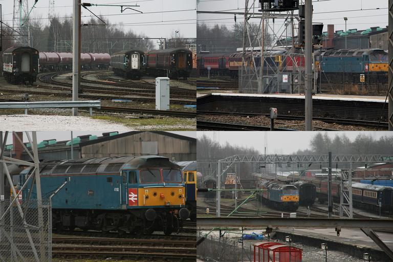 Keywords: CreweDieselTMDPhotos.jpg en Crewe Diesel TMD in February 2011 Top Left Several passenger coaches and EWS liveried chemical cars viewed from Crewe Station's platform 12 Bottom Left British Rail liveried Express Class 47 47853 in storage Top Right Four Class 47s including EWS 47747 at the rear Bottom Right A view of the four Class 47s and stored passenger coaches from the footbridge at Crewe own Samslipknot Cc-zero Crewe railway station |