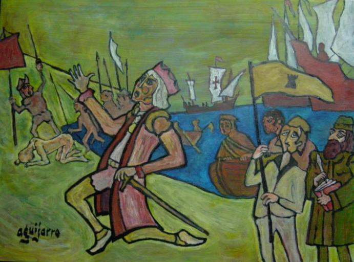 | Keywords: Cristobal Colón - Descubrimiento del Continente Colombino.JPG Cristobal Colón y su tripulación protagonizaron uno de los momentos cumbres de la Historia de la Humanidad al encontrar el 12 de octubre de 1492 un maravilloso obstáculo en su camino el Nuevo Mundo abriendo en forma gloriosa la llamada Edad Moderna A pesar de un evidente error de cálculo en las distancias Cristobal Colón fue acertado en sus predicciones como ninguno de sus contemporáneos y arrojado como el que más para lanzarse en pos de sus hermosos sueños por una ruta más que peligrosa Cristobal Colón realizó cuatro viajes de ida y vuelta desde España hasta las tierras descubiertas que estaban habitadas por descendientes de tribus siberianas emigradas en el Pleistoceno el periodo más antiguo del Cuaternario Si bien los vikingos en sus arriesgadas incursiones llegaron a pisar tierras americanas algunos siglos antes de que lo hiciera Cristobal Colón es incontrovertible el hecho de que tan solo a partir de los viajes de Colon es cuando Nuevo y Viejo Mundos han quedado permanentemente vinculados en una Civilización e Historia comunes Desde entonces los flujos de lenguajes creencias flora fauna y materias entre Europa y América no han dejado de influir trascendentalmente en el cotidiano vivir de los seres humanos de ambos continentes La República de Colombia recibió este nombre como homenaje a Colón Una gran parte de la Humanidad no acabamos de comprender por qué esa denominación no se le ha aplicado a todo el territorio descubierto en aquella gesta inolvidable En justicia y de acuerdo con las más elementales lógica y semántica el Continente Colombino nunca debería haberse llamado equívocamente americano Cristóbal Colón falleció en Valladolid España el día 20 de mayo de 1506 Desde entonces espera el día en que la Humanidad y sobretodo los habitantes actuales de la Europa que engrandeció y del Continente Colombino al que abrió las puertas reconozcan justamente la grandeza de su gesta y el protagonismo semántico que le corresponde Cristobal Colón - Descubrimiento del Continente Colombino injustamente llamado América por Aguijarro Antonio Guijarro Morales pintor y cardiólogo natural de Guadix Granada http //personal telefonica terra es/web/medicina/ultimas html Título del enlace Pinturas de Aguijarro 2007-03-20 own assumed Aguijarroo http //personal telefonica terra es/web/medicina/ultimas html Título del enlace Pinturas de Aguijarro Aguijarro Christopher Columbus in art |