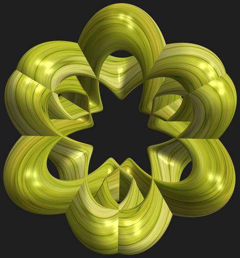 Keywords: mathematica 3d cg parametricplot3d texture torus code program algorithm プログラム コード アルゴリズム 輪環 りんかん ドーナツ どーなつ bamboo 竹 たけ タケ geometric sculpture geometricsculpture shape geometry sculpture mapping テクスチャ マッピング 模様 もよう abstract 抽象 ちゅうしょう アブストラクト design pattern デザイン パターン graphic グラフィック グラフィクス structure 意匠 構造 symmetry 対称性 たいしょうせい シンメトリー 対称 たいしょう indoor black background a = 3; (* center hole size *) b = 3; (* tri-torus *) c = 0.5; (* distance from the center of rotation *) d = 3; (* number of torus *) h = 2; (* height of a torus *) SetOptions[ParametricPlot3D, PlotRange -> Full, Mesh -> None, Boxed -> False, Axes -> False, PlotPoints -> 400, ImageSize -> 3000, Background -> RGBColor[{30, 30, 30}/255], PlotStyle -> Directive[Specularity[White, 90], Texture[Import["D:/tmp/71.jpg"]]], TextureCoordinateFunction -> ({#4 + #5, #5 / Pi} &), Lighting -> "Neutral"]; x = (a - Cos[t] - Sin[b s]) Cos[s]; y = (a - Cos[t] - Sin[b s]) Abs[Sin[s]] + c; z = (a - Sin[t] - h Sin[b s]); rm = Table[{x, y, z}.RotationMatrix[2 i Pi/d, {0, 0, 1}], {i, d}]; ParametricPlot3D[rm, {t, 0, 2 Pi}, {s, 0, 2 Pi}] (*--- The Texture *) a = 3; (* center hole size *) b = 3; (* tri-torus *) c = 0.5; (* distance from the center of rotation *) d = 3; (* number of torus *) h = 2; (* height of a torus *) SetOptions[ParametricPlot3D, PlotRange -> Full, Mesh -> None, Boxed -> False, Axes -> False, PlotPoints -> 400, ImageSize -> 3000, Background -> RGBColor[{30, 30, 30}/255], PlotStyle -> Directive[Specularity[White, 90], Texture[Import["D:/tmp/71.jpg"]]], TextureCoordinateFunction -> ({#4 + #5, #5 / Pi} &), Lighting -> "Neutral"]; x = (a - Cos[t] - Sin[b s]) Cos[s]; y = (a - Cos[t] - Sin[b s]) Abs[Sin[s]] + c; z = (a - Sin[t] - h Sin[b s]); rm = Table[{x, y, z}.RotationMatrix[2 i Pi/d, {0, 0, 1}], {i, d}]; ParametricPlot3D[rm, {t, 0, 2 Pi}, {s, 0, 2 Pi}] (*--- The Texture *) |