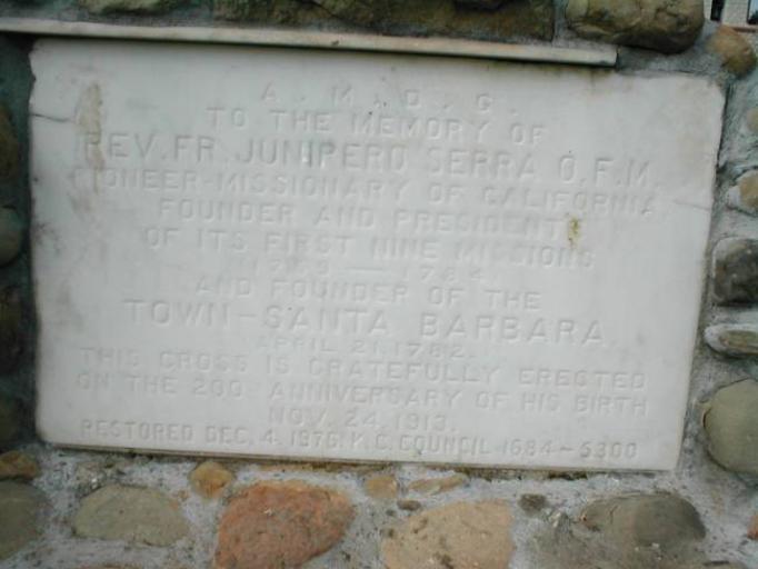 | Keywords: Crossplaque.JPG en Plaque underneath the cross at en Santa Barbara Mission The cross was erected in memory of Father Junipero Serra Own On or before 7 February 2007 NeilEvans in English Wikipedia transferred by Ymblanter NeilEvans en Original upload log page en wikipedia Crossplaque JPG Upload date User Bytes Dimensions Comment 2007-02-07 18 04 26 NeilEvans 34825 650×488 <small><nowiki>Cross underneath the cross at Santa Barbara Mission The cross was erected in memory of Father Junipero Serra </nowiki></small> JunÃpero Serra Plaques in Santa Barbara County California Mission Santa Barbara |