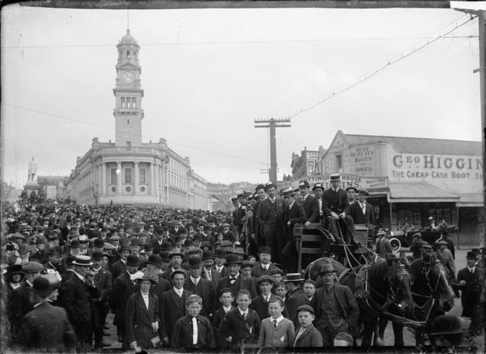 | Keywords: blackandwhite monochrome outdoor black and white View of Auckland Town Hall taken from Queen Street with the statue of Sir George Grey on the left and Grey Street on the right. A large crowd is gathered and all are looking towards the photographer. On the right is a horse and cart with a number of young men standing on board, some with cards in their hatbands. The reason for the gathering is not indicated but it may have been to listen to speeches by a politican or trade unionist. The business premises of George Higgins, bootmaker can be seen on the right behind the crowd. Photograph taken by William A Price, ca 1912-1914. Inscriptions: Inscribed - Photographer's title on negative -bottom centre: Grey's statue and Town Hall. Auckland. 105E [?]. William Archer Price lived and practised in Queen Street, Northcote, 1909-1910. Source: New Zealand Post Office directories Quantity: 1 b&w original negative(s). Physical Description: Dry plate glass negative 4.75 x 6.5 inches    Crowd in Queen Street near the Auckland Town Hall. Price, William Archer, 1866-1948 :Collection of post card negatives. Ref: 1/2-001652-G. Alexander Turnbull Library, Wellington, New Zealand. natlib.govt.nz/records/22325007 View of Auckland Town Hall taken from Queen Street with the statue of Sir George Grey on the left and Grey Street on the right. A large crowd is gathered and all are looking towards the photographer. On the right is a horse and cart with a number of young men standing on board, some with cards in their hatbands. The reason for the gathering is not indicated but it may have been to listen to speeches by a politican or trade unionist. The business premises of George Higgins, bootmaker can be seen on the right behind the crowd. Photograph taken by William A Price, ca 1912-1914. Inscriptions: Inscribed - Photographer's title on negative -bottom centre: Grey's statue and Town Hall. Auckland. 105E [?]. William Archer Price lived and practised in Queen Street, Northcote, 1909-1910. Source: New Zealand Post Office directories Quantity: 1 b&w original negative(s). Physical Description: Dry plate glass negative 4.75 x 6.5 inches    Crowd in Queen Street near the Auckland Town Hall. Price, William Archer, 1866-1948 :Collection of post card negatives. Ref: 1/2-001652-G. Alexander Turnbull Library, Wellington, New Zealand. natlib.govt.nz/records/22325007 |
