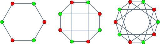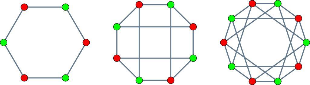 Keywords: Crown graphs.svg Crown graphs with six eight and ten vertices Own David Eppstein 2008-01-12 See also Crown graphs 2 svg for a representation of the same graphs as bipartite graphs Files by User David Eppstein from en wikipedia Crown graph 5 Cube graph Cycle graph 6 |