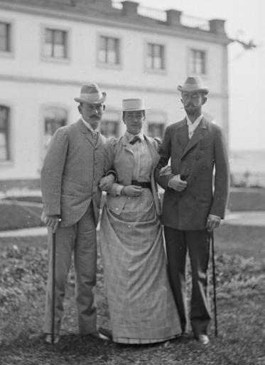 | Keywords: Crown princess Victoria of Baden with Max von Baden and crown prince Gustav in the 1890s.jpg Victoria of Baden surrounded by her cousin Maximilian von Baden left and her fiancee crown prince Gustav right The building behind them is Tullgarn castle south of Stockholm Staffan Tjerneld's biography Den mystiske dr Munthe Bonniers 1973 ISBN 910038564-6 2016-09-17 version from https //www flickr com/photos/tekniskamuseet/8111980043 flickr com early other date s 1890 Victoria of Baden took the photo herself with a self timer PD-old-70-1923 Black and white photographs Black and white photographs of women and men 1890s portrait photographs Sweden in the 1890s Victoria of Baden Gustav V of Sweden Prince Maximilian of Baden 1893 Tullgarns slott |