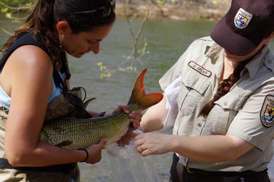 Keywords: u. s. fish and wildlife service usfishandwildlifeservice sicklefin north carolina wildlife resources commission northcarolinawildliferesourcescommission tva tennessee valley authority tennesseevalleyauthority conservation fisheries conservationfisheries cfi duke energy outdoor For several years, the N.C. Wildlife Resources Commission has led efforts to conserve the rare sicklefin redhorse, a fish found only in the Little Tennessee and Hiawassee River basins. Part of that effort is the collection and fertilization of eggs each spring, which are then hatched and the young raised in captivity for stocking. This effort also includes tagging the fish with an identifying tag, like one would put a chip in a pet. This year’s work comes on the heels of a new Candidate Conservation Agreement, which brought together the Service, the N.C. Wildlife Resources Commission, the Eastern Band of Cherokee Indians, Duke Energy, and the Tennessee Valley Authority to conserve the fish before it needs the protection of the Endangered Species Act. All the signatory agencies contributed staff to the field effort, in addition to Conservation Fisheries, Inc. Photo credit: G. Peeples/USFWS For several years, the N.C. Wildlife Resources Commission has led efforts to conserve the rare sicklefin redhorse, a fish found only in the Little Tennessee and Hiawassee River basins. Part of that effort is the collection and fertilization of eggs each spring, which are then hatched and the young raised in captivity for stocking. This effort also includes tagging the fish with an identifying tag, like one would put a chip in a pet. This year’s work comes on the heels of a new Candidate Conservation Agreement, which brought together the Service, the N.C. Wildlife Resources Commission, the Eastern Band of Cherokee Indians, Duke Energy, and the Tennessee Valley Authority to conserve the fish before it needs the protection of the Endangered Species Act. All the signatory agencies contributed staff to the field effort, in addition to Conservation Fisheries, Inc. Photo credit: G. Peeples/USFWS