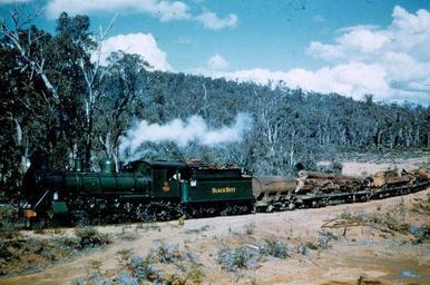 Keywords: Cs270, Banksiadale line, ca. 1960.jpg WAGR C class steam locomotive no Cs270 Eucalyptus patens Black Butt hauling a log train on the Western Australian Government Railways WAGR saw mill line at Banksiadale Western Australia Banksiadale Western Australia http //www railheritagewa org au/archive_scans/displayimage php pid 138 Rail Heritage WA Archive Photo Gallery image T0134 Source claims copyright but image is Public Domain Type of material E in the following table <br> PD-Australia Banksiadale railway line WAGR C class |