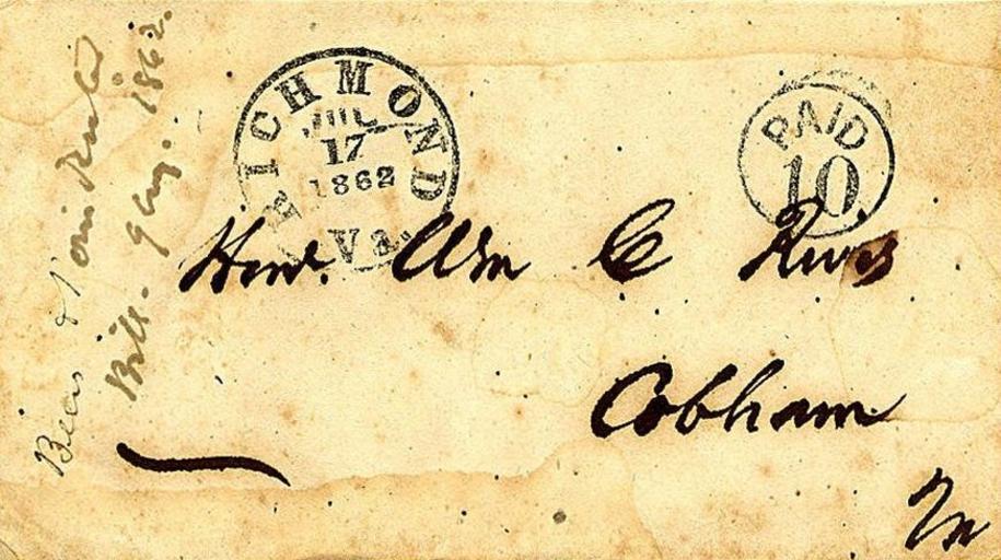 Keywords: CSA paid-10c 1862.jpg en Confederate hand stamped provisional cover 1862 Cover mailed after the new uniform postage rate of ten cents had gone into effect July 1 1862 <br/>Addressee reads William Cabell Rives who was at that time a member of the Confederate Congress Rives had also served in the United States Senate and House of Representatives and as Ambassador to France Former Confederate States of America Post Office<br/>http //arago si edu/index asp con 2 cmd 1 id 159179 img 1 mode 1 pg 1 tid 2028297 Smithsonian National Postal Museum Confederate Hand-stamped covers<br/>Photo image obtained/rendered by Gwillhickers Former Confederate States of America Post Office 1862-07-17 PD-old Confederate States of America Postal history of the United States Stampless covers of the United States Ambassadors of the United States Rives William Cabell Ambassadors to France Rives William Cabell Rubber stamp imprints |