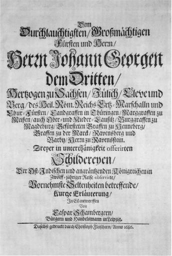 | Keywords: CSchamberger Erlaeuterungen 1686.jpg en Titlepage of a booklet published by the surgeon / merchant Caspar Schamberger dealing with people plants coins and other observations made during his stay in East Asia de Titelblatt einer Schrift des Chirurgen und Handelsmanns Caspar Schamberger über Völker Pflanzen Münzen und andere Beobachtungen die er während seines Aufenthaltes in Ostasien machte Dreyer in unterthänigkeit offerirten Schildereyen der Ost Indischen und angräntzenden Königreichen in zwölffjähriger Reise observirte vornehmste Seltenheiten betreffende kurtze Erläuterung Caspar Schamberger 1686 PD-old-100 Dutch East India Company Caspar Schamberger Title pages from Germany |