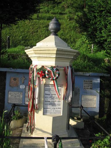 Keywords: Csoma de Koros' tomb and monument (Darjeeling).JPG en Over the tomb of Alexander Csoma de Koros in a cemetery of Darjeeling has been erected this monument often garlanded with khatas own Grentidez 2013-06 Released for general use Sándor Kőrösi Csoma Monuments and memorials in Darjeeling Khata / Haddak Tombs in West Bengal Green red white Hungarian inscriptions Multilingual plaques Cc-zero |