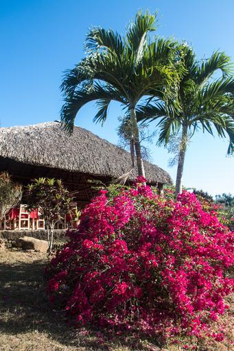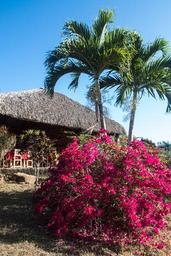 Keywords: cuba palm trees bush thatched roof bougainvillea