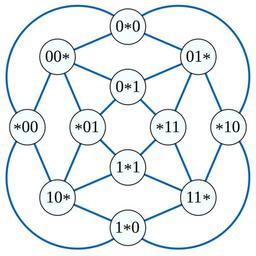 | Keywords: Cube-face-intersection-graph.svg intersection graph of the edges of a cube Equivalently a graph in which the vertices represent two-bit samples of a 3-bit bitstring Induced subgraphs of analogously defined graphs for larger numbers of bits play a key role in proofs of hardness of approximation for the clique problem own http //11011110 livejournal com/167402 html David Eppstein 2009-03-21 Undirected planar graphs Files by User David Eppstein from en wikipedia Graphs with 12 vertices Related to the cube |
