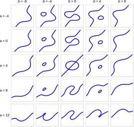 | Keywords: CubicCurve.svg This is a collection of cubic curves the equation with parameters a and b see below Region shown -5 5² екото ые виды кубик у авнение см ниже Показан егион -5 5² <math>4 x 3 - a x 2 y + 9 x y 2 - 9 y 3 - 36 x + 36 y + 10 b \ \ 0</math> Own 2008-02-14 Tos Created with Mathematica <source lang c > GraphicsArray Table ContourPlot 4 x 3 - a x 2 y + 9 x y 2 - 9 y 3 - 36 x + 36 y + 10 b 0 x -5 5 y -5 5 FrameTicks -> None ContourStyle -> Blue Thick a -4 12 4 b -8 8 4 </source> Cubic curves |