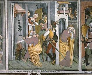 | Keywords: Cuisine.medieval.jpg  Sanctuaire Notre-Dame des Fontaines La Brigue - nef mur latéral sud registre inférieur - - Cycle de la Passion du Christ Reniement de saint Pierre 10/25 - - Vue d'ensemble - PD-old Second Denial of Saint Peter Chapelle Notre-Dame-des-Fontaines de La Brigue Third Denial of Saint Peter  |