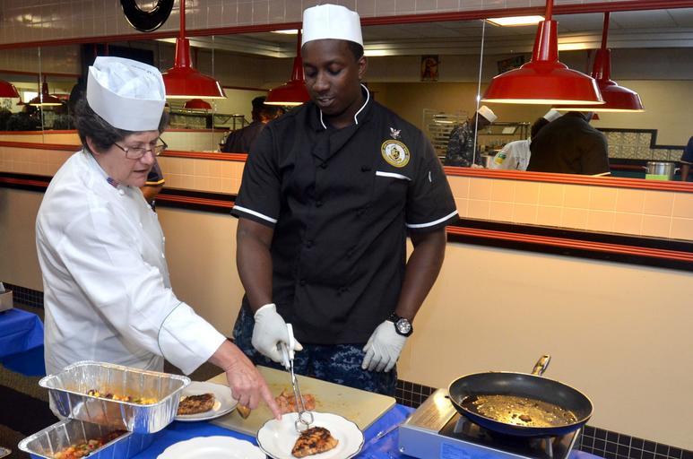 Keywords: Culinary training session 130905-N-IS680-048.jpg en Nydia Ekstrom left a certified executive chef with Unilever Food Solutions conducts training at the Dam Neck Annex base galley with Culinary Specialist 2nd Class Antonio Bell from Joint Expeditionary Base Little Creek-Fort Story U S Navy photo by Mass Communication Specialist 2nd Class Alysia R Hernandez/Released 2013-09-10 Petty Officer 2nd Class Alysia Hernandez https //www dvidshub net/image/1014849 130905-N-IS680-048 2013-09-10 23 23 VIRGINIA BEACH VA US PD-USGov-Military-Navy Joint Expeditionary Base Little Creek-Fort Story Images from DoD uploaded by Fæ |