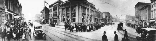 Keywords: cibc canadian imperial bank of commerce canadianimperialbankofcommerce thunder bay thunderbay port arthur portarthur police crowd automobiles businesses banks cumberland street cumberlandstreet panorama arthur street arthurstreet red river road redriverroad darling & pearson darlingpearson ontario canada history blackandwhite monochrome outdoor black and white Date: 1910s Description: This photograph offers a panoramic view of the corner of South Cumberland Street and Arthur Street (now Red River Road) in the 1910s. The Canadian Imperial Bank of Commerce (CIBC), flanked by a number of businesses, sits in the centre of the photo. The bank was designed by the Toronto based architectural firm of Darling & Pearson (Frank Darling and John A. Pearson) and built in 1905. The people in the photo were invited by the photographer to gather and be part of the picture. Accession No.: 973.68.23 Date: 1910s Description: This photograph offers a panoramic view of the corner of South Cumberland Street and Arthur Street (now Red River Road) in the 1910s. The Canadian Imperial Bank of Commerce (CIBC), flanked by a number of businesses, sits in the centre of the photo. The bank was designed by the Toronto based architectural firm of Darling & Pearson (Frank Darling and John A. Pearson) and built in 1905. The people in the photo were invited by the photographer to gather and be part of the picture. Accession No.: 973.68.23