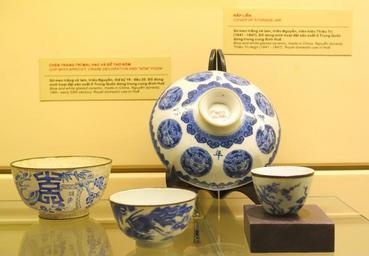 | Keywords: Cups and storage jar for royal domestic use in Hue, made in China, Nguyen dynasty, 19th to early 20th century, blue and white glazed ceramic - National Museum of Vietnamese History - Hanoi, Vietnam - DSC05634.JPG en Exhibit in the National Museum of Vietnamese History Hanoi Vietnam Photography was permitted in the museum without restriction This artwork is old enough so that it is in the public domain 2014-08-06 03 33 29 own Daderot other versions cc-zero Nguyễn dynasty ceramics in the National Museum of Vietnamese History Uploaded with UploadWizard |