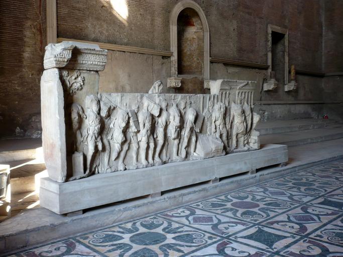 Keywords: Curia Fregio sinistro.JPG Curia Iulia a Roma fregio romano sinistro Si noti il pavimento in opus sectile Own 2007-12-28 Zanner Plutei of Trajan Reliefs Ancient Roman reliefs in Rome Curia Ancient Roman opus sectile Curia Iulia