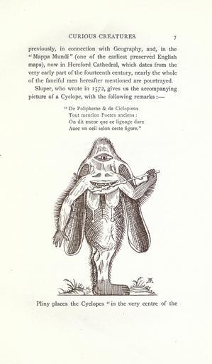 | Keywords: Curious creatures in zoology (15382481287).jpg CURIOUS CREATURES 7 <br> previously in connection with Geography and in the <br> Mappa Mundi one of the earliest preserved English <br> maps now in Hereford Cathedral which dates from the <br> very early part of the fourteenth century nearly the whole <br> of the fanciful men hereafter mentioned are pourtrayed <br> Sluper who wrote in 1572 gives us the accompanying <br> picture of a Cyclope with the following remarks <br> De Polipheme de Ciclopiens <br> Tout mention Poetes anciens <br> On dit encor que ce lignage dure <br> Auec vn ceil selon ceste figure <br> Pliny places the Cyclopes in the very centre of the 23574762 76213 32031 Page 7 Text http //www biodiversitylibrary org/page/23574762 1890 10 5962/bhl title 32031 Ashton John NameFound Cyclope NameConfirmed Cyclope EOLID 2972856 NameBankID 4132347 NameFound Mappa NameConfirmed Mappa A Juss EOLID 5278577 NameBankID 1820278 NameFound Poetes anciens Biodiversity Heritage Library Curious creatures in zoology; with 130 illus throughout the text Mermaids Monsters Are Real Animals University of California Libraries archive org bhl page 23574762 dc identifier http //biodiversitylibrary org/page/23574762 bhlMonstersRreal Halloween mermaid university of california libraries archive org bhlmonstersrreal Information field Flickr posted date ISOdate 2014-10-19 CC-BY-2 0 BioDivLibrary https //flickr com/photos/61021753 N02/15382481287 2015-08-25 21 51 55 cc-by-2 0 PD-old-70-1923 Curious creatures in zoology Photos uploaded from Flickr by Fæ using a script |