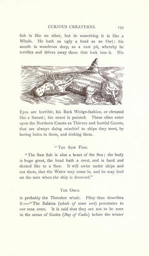 | Keywords: Curious creatures in zoology (14948444623).jpg CURIOUS CREATURES 239 <br> fish is like no other but in something it is like a <br> Whale He hath as ugly a head as an Owl his <br> mouth is wondrous deep as a vast pit whereby he <br> terrifies and drives away those that look into it His <br> Eyes are horrible his Back Wedge-fashion or elevated <br> like a Sword ; his snout is pointed These often enter <br> upon the Northern Coasts as Thieves and hurtful Guests <br> that are always doing mischief to ships they meet by <br> boring holes in them and sinking them <br> THE SAW FISH <br> The Saw fish is also a beast of the Sea ; the body <br> is huge great the head hath a crest and is hard and <br> dented like to a Saw It will swim under ships and <br> cut them that the Water may come in and he may feed <br> on the men when- the ship is drowned <br> THE ORCA <br> is probably the Thresher whale Pliny thus describes <br> it The Balaena whale of some sorf penetrates to <br> our seas even It is said that they are not to be seen <br> in the ocean of Gades Bay of Cadiz before the winter 23574994 76213 32031 Page 239 Text http //www biodiversitylibrary org/page/23574994 1890 10 5962/bhl title 32031 Ashton John NameFound Balaena NameConfirmed Balaena EOLID 42379 NameBankID 3345699 NameFound Orca NameConfirmed Orca Gray 1846 EOLID 42365 Biodiversity Heritage Library Leviathans Curious creatures in zoology; with 130 illus throughout the text Monsters Are Real Animals University of California Libraries archive org bhl page 23574994 dc identifier http //biodiversitylibrary org/page/23574994 bhlMonstersRreal Halloween leviathan university of california libraries archive org bhlmonstersrreal Information field Flickr posted date ISOdate 2014-10-19 CC-BY-2 0 BioDivLibrary https //flickr com/photos/61021753 N02/14948444623 2015-08-25 20 54 56 cc-by-2 0 PD-old-70-1923 leviathan Curious creatures in zoology Photos uploaded from Flickr by Fæ using a script |