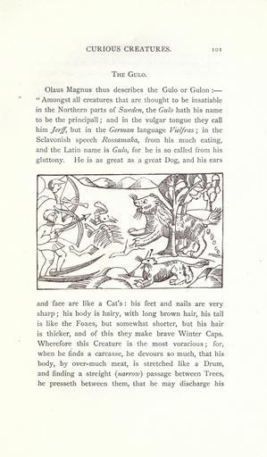 Keywords: Curious creatures in zoology (14948355893).jpg CURIOUS CREATURES <br> THE GULO <br> Olaus Magnus thus describes the Gulo or Gulon <br> Amongst all creatures that are thought to be insatiable <br> in the Northern parts of Sweden the Gulo hath his name <br> to be the principal 1 ; and in the vulgar tongue they call <br> him Jerff but in the German language Vielfras ; in the <br> Sclavonish speech Rossamaka from his much eating <br> and the Latin name is Gulo for he is so called from his <br> gluttony He is as great as a great Dog and his ears <br> and face are like a Cat's his feet and nails are very <br> sharp ; his body is hairy with long brown hair his tail <br> is like the Foxes but somewhat shorter but his hair <br> is thicker and of this they make brave Winter Caps <br> Wherefore this Creature is the most voracious ; for <br> when he finds a carcasse he devours so much that his <br> body by over-much meat is stretched like a Drum <br> and finding a streight narroiv passage between Trees <br> he presseth between them that he may discharge his 23574856 76213 32031 Page 101 Text http //www biodiversitylibrary org/page/23574856 1890 10 5962/bhl title 32031 Ashton John NameFound Gulo NameConfirmed Gulo EOLID 34550 NameBankID 2478310 NameFound Magnus Biodiversity Heritage Library Curious creatures in zoology; with 130 illus throughout the text Monsters Are Real Animals University of California Libraries archive org bhl page 23574856 dc identifier http //biodiversitylibrary org/page/23574856 bhlMonstersRreal Halloween university of california libraries archive org bhlmonstersrreal Information field Flickr posted date ISOdate 2014-10-19 CC-BY-2 0 BioDivLibrary https //flickr com/photos/61021753 N02/14948355893 2015-08-25 21 54 08 cc-by-2 0 PD-old-70-1923 Curious creatures in zoology Photos uploaded from Flickr by Fæ using a script |