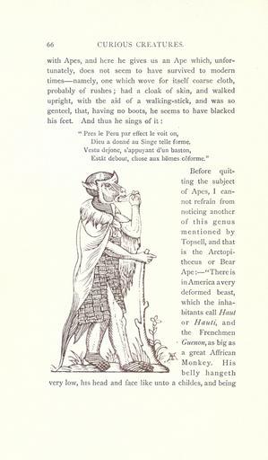 | Keywords: Curious creatures in zoology (15568512905).jpg CURIOUS CREATURES <br> with Apes and here he gives us an Ape which unfor- <br> tunately does not seem to have survived to modern <br> times namely one which wove for itself coarse cloth <br> probably of rushes; had a cloak of skin and walked <br> upright with the aid of a walking-stick and was so <br> genteel that having no boots he seems to have blacked <br> his feet And thus he sings of it <br> Pres le Peru par effect le voit on <br> Dieu a donne au Singe telle forme <br> Vestu dejonc s'appuyant d'un baston <br> Estat debout chose aux homes coforme <br> Before quit- <br> ting the subject <br> of Apes I can- <br> not refrain from <br> noticing another <br> of this genus <br> mentioned by <br> Topsell and that <br> is the Arctopi- <br> thecus or Bear <br> Ape There is <br> in America a very <br> deformed beast <br> which the inha- <br> bitants call Haul <br> or Hauti and <br> the Frenchmen <br> Guenon as big as <br> a great Affrican <br> Monkey His <br> belly hangeth <br> very low his head and face like unto a childes and being 23574821 76213 32031 Page 66 Text http //www biodiversitylibrary org/page/23574821 1890 10 5962/bhl title 32031 Ashton John Biodiversity Heritage Library Curious creatures in zoology; with 130 illus throughout the text Monsters Are Real Animals University of California Libraries archive org bhl page 23574821 dc identifier http //biodiversitylibrary org/page/23574821 bhlMonstersRreal Halloween university of california libraries archive org bhlmonstersrreal Information field Flickr posted date ISOdate 2014-10-19 CC-BY-2 0 BioDivLibrary https //flickr com/photos/61021753 N02/15568512905 2015-08-25 21 54 45 cc-by-2 0 PD-old-70-1923 Curious creatures in zoology Photos uploaded from Flickr by Fæ using a script |