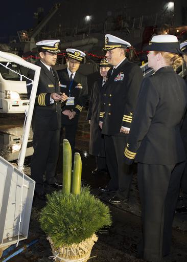 | Keywords: Curtis Wilbur and Kirishima gift exchange 131219-N-TX154-024.jpg en Capt Yasuhiro Sato commanding officer of the Japan Maritime Self-Defense Force guided-missile destroyer JS Kirishima DDG 174 presents a Kadomatsu a traditional Japanese token of good fortune to Cmdr Hans De For and Cmdr Amy Graham commanding officer and executive officer of the guided-missile destroyer USS Curtis Wilbur DDG 54 during a Christmas gift exchange Curtis Wilbur and Kirishima have been sister ships since 1996 when Curtis Wilbur shifted to Yokosuka and have exchanged gifts every year for the past 17 years U S Navy photo by Mass Communication Specialist 3rd Class Paul Kelly/Released <br>Unit Navy Media Content Services 2013-12-19 Petty Officer 3rd Class Paul Kelly https //www dvidshub net/image/1142740/curtis-wilbur-and-kirishima-gift-exchange 131219-N-TX154-024 2013-12-20 19 37 FLEACT YOKOSUKA JP PD-USGov-Military-Navy USS Curtis Wilbur DDG-54 Images from DoD uploaded by Fæ |