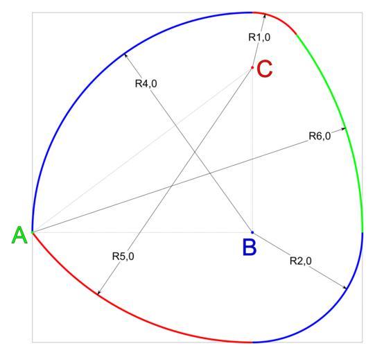 | Keywords: Curve of constant width.svg pl Figura o stałej szerokości równej 6 Punkty A B C są wierzchołkami trójkąta o bokach długości 3 4 i 5 Figura składa się z łuków kół o środku w A i promieniu 6 kolor zielony o środku w punkcie C i promieniach 1 i 5 kolor czerwony oraz o środku w punkcie B i promieniach 2 i 4 kolor niebieski Curve of constant width 6 units The perimeter consists of five circular arcs and one degenerate arc whose centres are the vertices of a 3 4 5 right triangle The green arc of radius 6 and the degenerate arc of radius 0 are drawn around vertex A the blue arcs of radius 2 and 4 around vertex B and the red arcs of radius 1 and 5 around vertex C own on the basis of picture formerly on pl Wiki at http //pl wikipedia org/wiki/Plik Curveofconstantwidth jpg CLI 2010-04-29 For alternative version and details on how this curve would be constructed see File How to make mathematical roller curve based on triangle svg <gallery>File How to make mathematical roller curve based on triangle svg</gallery> Curves of constant width |