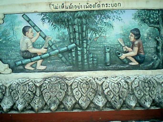 | Keywords: Cutting bamboo.JPG ไม่ ห็นน้ำอย่า พ้อตัดกระบอก -- Illustrated Proverb Don't cut bamboo without first checking for thorns Phra That Phanom chedi Amphoe That Phanom Nakhon Phanom Province northeastern Thailand 2004-06-21 Pawyi Lee Public domain Bamboo in art Reliefs in Thailand Wat Phra Tat Phanom Thai proverbs |