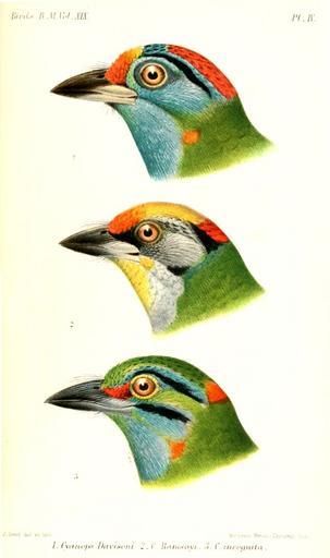 | Keywords: CyanopsSmit.jpg Heads of three Asian barbets Cyanops davisoni Megalaima asiatica davisoni Blue-throated Barbet ssp top ; Cyanops ramsayi Megalaima franklinii ramsayi Golden-throated Barbet ssp middle ; and Cyanops incognita Megalaima incognita Moustached Barbet bottom Catalogue of the Birds in the British Museum Volume 19 1891 Creator John Gerrard Keulemans File Megalaima incognita Keulemans jpg PD-old-100 John Gerrard Keulemans Catalogue of the Birds in the British Museum Megalaima asiatica Megalaima franklinii Megalaima incognita Megalaima heads |