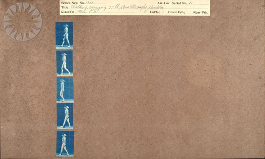 | Keywords: photography physics inventors muybridge smithsonian probably public domain probablypublicdomain SI Neg. 2004-41223. Date: na....Title: "Walking, carrying 75 lb. stone on right shoulder.".Series Neg. No. 1355.An. Loc. Serial No. 31.Classification: "Man P.C."..Muybridge's cyanotypes are working proofs, the contact prints he made from more than 20,000 negatives he took at the University of Pennsylvania between 1884 and 1886 while photographing human and animal subjects in motion from lateral (parallel), front and rear positions. Since the original negatives no longer exist, the cyanotypes provide us with the opportunity to see the pictures Muybridge achieved before he edited and cropped them for publication..From the Photographic History Collection, National Museum of American History...Credit: Eadweard Muybridge (Smithsonian Institution) SI Neg. 2004-41223. Date: na....Title: "Walking, carrying 75 lb. stone on right shoulder.".Series Neg. No. 1355.An. Loc. Serial No. 31.Classification: "Man P.C."..Muybridge's cyanotypes are working proofs, the contact prints he made from more than 20,000 negatives he took at the University of Pennsylvania between 1884 and 1886 while photographing human and animal subjects in motion from lateral (parallel), front and rear positions. Since the original negatives no longer exist, the cyanotypes provide us with the opportunity to see the pictures Muybridge achieved before he edited and cropped them for publication..From the Photographic History Collection, National Museum of American History...Credit: Eadweard Muybridge (Smithsonian Institution) |