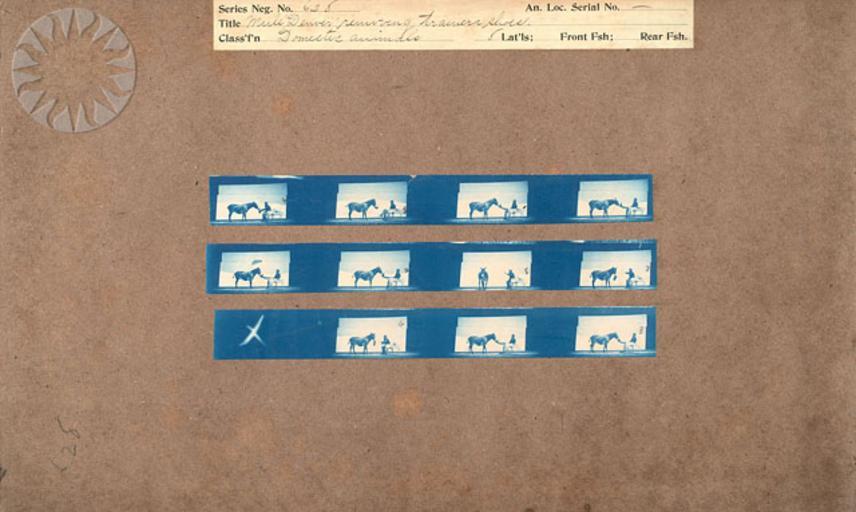 Keywords: photography physics inventors muybridge smithsonian probably public domain probablypublicdomain SI Neg. 2004-41323. Date: na....Title: "Mule 'Denver' removing trainers shoes.".Series Neg. No. 628.An. Loc. Serial No. None.Classification: "Domestic Animals.".Muybridge's cyanotypes are working proofs, the contact prints he made from more than 20,000 negatives he took at the University of Pennsylvania between 1884 and 1886 while photographing human and animal subjects in motion from lateral (parallel), front and rear positions. Since the original negatives no longer exist, the cyanotypes provide us with the opportunity to see the pictures Muybridge achieved before he edited and cropped them for publication..From the Photographic History Collection, National Museum of American History...Credit: Eadweard Muybridge (Smithsonian Institution) SI Neg. 2004-41323. Date: na....Title: "Mule 'Denver' removing trainers shoes.".Series Neg. No. 628.An. Loc. Serial No. None.Classification: "Domestic Animals.".Muybridge's cyanotypes are working proofs, the contact prints he made from more than 20,000 negatives he took at the University of Pennsylvania between 1884 and 1886 while photographing human and animal subjects in motion from lateral (parallel), front and rear positions. Since the original negatives no longer exist, the cyanotypes provide us with the opportunity to see the pictures Muybridge achieved before he edited and cropped them for publication..From the Photographic History Collection, National Museum of American History...Credit: Eadweard Muybridge (Smithsonian Institution) |