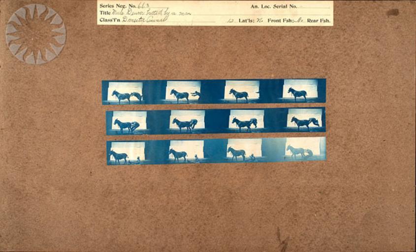 | Keywords: photography physics inventors muybridge smithsonian probably public domain probablypublicdomain SI Neg. 2004-41354. Date: na....Title: "Mule Denver butted by a man.".Series Neg. No. 663.An. Loc. Serial No. None.Classification: "Domestic Animals.".Muybridge's cyanotypes are working proofs, the contact prints he made from more than 20,000 negatives he took at the University of Pennsylvania between 1884 and 1886 while photographing human and animal subjects in motion from lateral (parallel), front and rear positions. Since the original negatives no longer exist, the cyanotypes provide us with the opportunity to see the pictures Muybridge achieved before he edited and cropped them for publication..From the Photographic History Collection, National Museum of American History...Credit: Eadweard Muybridge (Smithsonian Institution) SI Neg. 2004-41354. Date: na....Title: "Mule Denver butted by a man.".Series Neg. No. 663.An. Loc. Serial No. None.Classification: "Domestic Animals.".Muybridge's cyanotypes are working proofs, the contact prints he made from more than 20,000 negatives he took at the University of Pennsylvania between 1884 and 1886 while photographing human and animal subjects in motion from lateral (parallel), front and rear positions. Since the original negatives no longer exist, the cyanotypes provide us with the opportunity to see the pictures Muybridge achieved before he edited and cropped them for publication..From the Photographic History Collection, National Museum of American History...Credit: Eadweard Muybridge (Smithsonian Institution) |