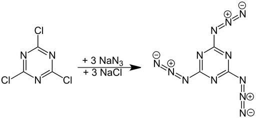 Keywords: Cyanurtriazide Synthesis V.1.svg en Cyanurtriazide_Synthesis de Cyanurtriazid_Synthese own Jü 2012-04-14 Triazines Cc-zero