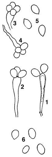 | Keywords: Cyathus-olla-in-Martin-1927.jpg en Basidia and spores of the bird's nest fungus Cyathus olla Figures renumbered <br /> 1-3 Mature basidia with two three and four spores; <br />4 Basidium collapsing with spores still attached; <br />5 Spores immediately after separation from basidia showing conspicuous apiculus; <br />6 Older spores; apiculus nearly or quite gone Martin GW 1927 Basidia and spores of the Nidulariaceae Mycologia 19 5 239-247 Plate 22 George W Martin 1927 PD-old Cyathus olla |