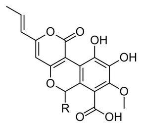 | Keywords: Cyathuscavin general structure.svg validSVG OCH<sub>3</sub> cyathuscavin B; R OH cyathuscavin C Own work after cite journal Kang HS Kim KR Jun EM et al Cyathuscavins A B and C new free radical scavengers with DNA protection activity from the Basidiomycete Cyathus stercoreus Bioorg Med Chem Lett 18 14 4047 “50 2008 July PMID 18565749 10 1016/j bmcl 2008 05 110 Fvasconcellos 2008-01-11 Diterpenes Polyketide antibiotics | ||||