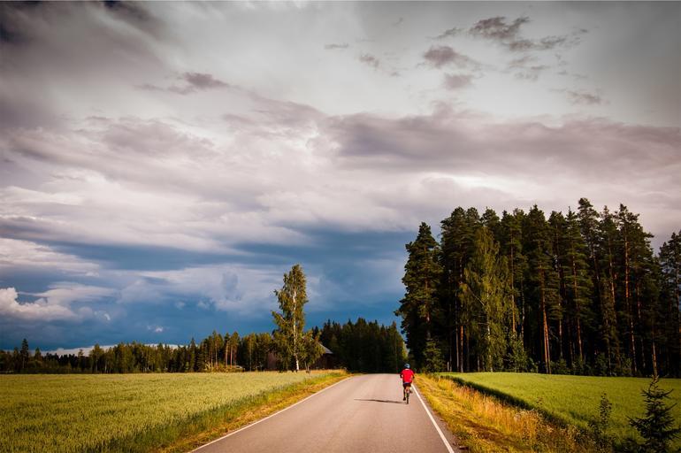 Keywords: cyclist cycling bicycle bike biking fitness exercise fields grass rural road forest trees sky clouds sunshine
