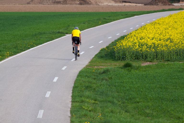 Keywords: cyclists road mark oilseed rape agricultural operation yellow field harvest field of rapeseeds arable cultivation flower landscape meadow dandelion shirt cycling shorts