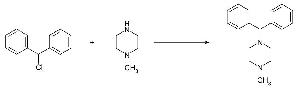 Keywords: Cyclizine synthesis01.svg en Synthesis of cyclizine de Synthese von Cyclizin own Steffen 962 2013-01-10 PD-chem Cc-zero Cyclizine Drug syntheses