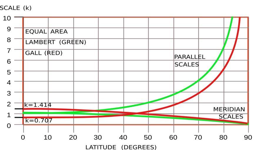 | Keywords: Cyl proj scale Lambert Gall.svg en The Lambert and Gall are equal area projections The green curves commencing at k 1 are for the Lambert the parallel scale k increases from k 1 at the equator to infinity at the pole and the meridian scale decreases from 1 at the equator to zero at the pole The product hk 1 guarantees equal area In the Gall red the parallel scale increases to infinity from k 0 707 at the equator and the meridian scale decreases from k 1 414 at the equator to zero at the pole Both Gall scales are equal h k 1 on the standard parallel defined by k 1 at a latitude of 45 degrees own Peter Mercator Cylindrical projection SVG charts in English Lambert cylindrical equal-area projection Gall-Peters projection |
