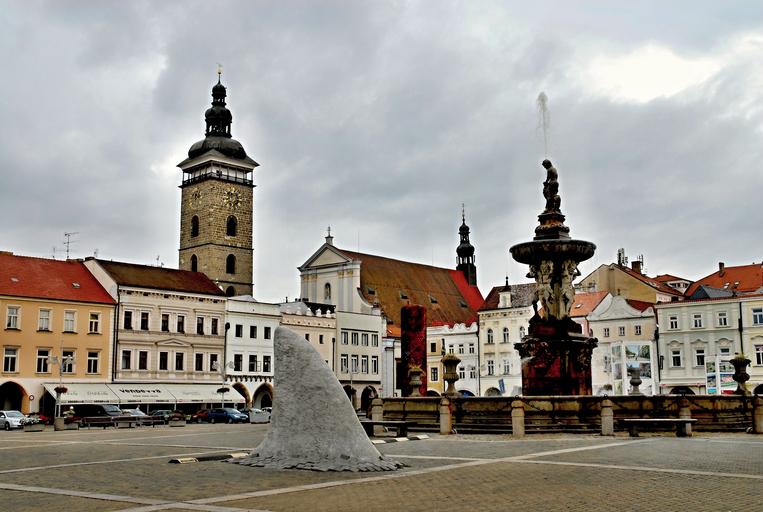 Keywords: czech budejovice square black tower fountain samson shark fin recession