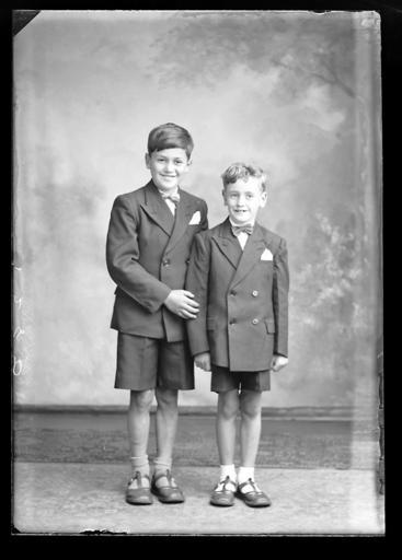 | Keywords: blackandwhite groupshot people monochrome photo border black and white Creator: H.F. Cooper Photographer, Strabane Date: c.1935 Original Format: Glass Plate Negative Description: Standing portrait of two boys (c. 10 and 8 years) wearing bow-ties - possibly brothers. PRONI Ref: D1422~B76485_D_014 Copying and copyright: Please see www.proni.gov.uk/index/research_and_records_held/copying_... For Copy Orders, contact: Email: proni@dcalni.gov.uk For fees and charges see: www.proni.gov.uk/index/about_proni/are_there_any_fees_and... Creator: H.F. Cooper Photographer, Strabane Date: c.1935 Original Format: Glass Plate Negative Description: Standing portrait of two boys (c. 10 and 8 years) wearing bow-ties - possibly brothers. PRONI Ref: D1422~B76485_D_014 Copying and copyright: Please see www.proni.gov.uk/index/research_and_records_held/copying_... For Copy Orders, contact: Email: proni@dcalni.gov.uk For fees and charges see: www.proni.gov.uk/index/about_proni/are_there_any_fees_and... |