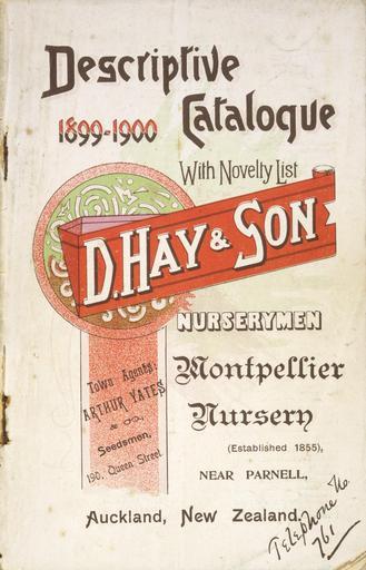 | Keywords: text sign writing signboard Shows arrangement of assorted styles of text, and some decorative elements (scroll, circular cut-out pattern). Quantity: 1 colour photo-mechanical print(s) on front cover of sales catalogue.. Physical Description: Offset lithograph, 214 x 140 mm. Provenance: Acquired in 1980. D Hay & Son, Nurserymen :Descriptive catalogue 1899-1900, with novelty list. Montpellier Nursery near Parnell, Auckland, New Zealand. [Front cover]. 1899.. [Ephemera and horticulture sales catalogues issued by New Zealand plant nurseries, 1870-1899].. Ref: Eph-A-HORTICULTURE-1899-01-front. Alexander Turnbull Library, Wellington, New Zealand. natlib.govt.nz/records/23029569 Shows arrangement of assorted styles of text, and some decorative elements (scroll, circular cut-out pattern). Quantity: 1 colour photo-mechanical print(s) on front cover of sales catalogue.. Physical Description: Offset lithograph, 214 x 140 mm. Provenance: Acquired in 1980. D Hay & Son, Nurserymen :Descriptive catalogue 1899-1900, with novelty list. Montpellier Nursery near Parnell, Auckland, New Zealand. [Front cover]. 1899.. [Ephemera and horticulture sales catalogues issued by New Zealand plant nurseries, 1870-1899].. Ref: Eph-A-HORTICULTURE-1899-01-front. Alexander Turnbull Library, Wellington, New Zealand. natlib.govt.nz/records/23029569 |