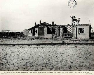 Keywords: archives state records nsw staterecordsnsw newsouthwales blackandwhite daceyville suburb garden suburb gardensuburb sydney houses federation style federationstyle public housing publichousing outdoor vehicle railroad black and white Houses built with Sampson concrete blocks in course of construction, Dacey Garden suburb Dated: 1915 Digital ID: 5225_a018_a018000037 Rights: www.records.nsw.gov.au/about-us/rights-and-permissions We'd love to hear from you if you use our photos. From a series of photographs of 'Dacey Garden Suburb' (Daceyville) - a development by the Housing Board of NSW as Sydney's "first planned modern garden suburb". Daceyville was developed between 1913 and 1918 and is located in south-eastern Sydney within the municipalities of Mascot and Botany. The images in the series show scenes of the area before development, road building, the types of houses built, shops, as well as the Public School. The suburb was named after the state parliamentarian John Rowland Dacey who played a vital role in the approval of this urban development. Many other photos in our collection are available to view and browse on our website using Photo Investigator. Houses built with Sampson concrete blocks in course of construction, Dacey Garden suburb Dated: 1915 Digital ID: 5225_a018_a018000037 Rights: www.records.nsw.gov.au/about-us/rights-and-permissions We'd love to hear from you if you use our photos. From a series of photographs of 'Dacey Garden Suburb' (Daceyville) - a development by the Housing Board of NSW as Sydney's "first planned modern garden suburb". Daceyville was developed between 1913 and 1918 and is located in south-eastern Sydney within the municipalities of Mascot and Botany. The images in the series show scenes of the area before development, road building, the types of houses built, shops, as well as the Public School. The suburb was named after the state parliamentarian John Rowland Dacey who played a vital role in the approval of this urban development. Many other photos in our collection are available to view and browse on our website using Photo Investigator. |