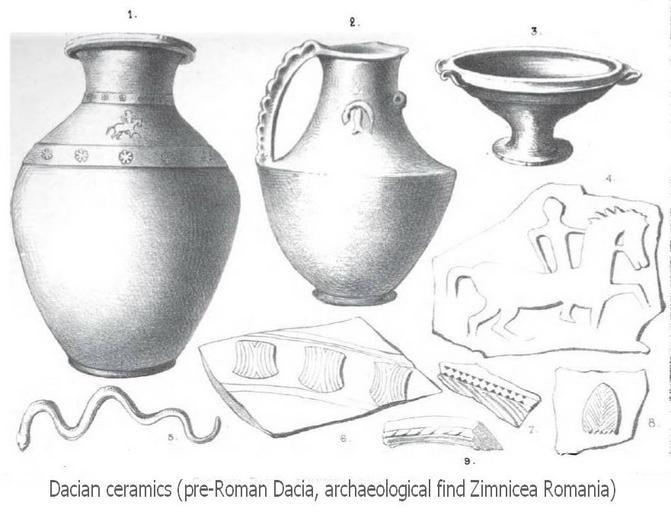 | Keywords: Dacian ceramic (finds Zimnicea, pre-Roman Dacia).JPG en Archaeological finds Dacian ceramics from Zimnicea Romania pre-Roman Dacia <br />notes 1 Urn height 76 cm with a rider depiction repeated 6 times 2 Cup with the representation of a snake and a horse's hoof 3 Pedestal platter 4 The rider from 1 urn 5 The snake from 2 cup 6 ornament from 1 urn 7 ornament 8 ornament 8 ornament Dacia Inainte de Roman 'Pre-Roman Dacia' published in 1877 in Annals of the Romanian Academic Society Ragguagli de' lavori accademici per l'anno 1826 -1830 Societa reale borbonica Annalele Societatii Academice Romane at Bucuresci Bucharest Romania Tocilescu Grigore George 26 October 1850 “ 18 September 1909 1877 PD-old author Tocilescu Grigore George 1850 “ 1909 was a Romanian historian archaeologist epigrapher and folkorist member of Romanian Academy info image this image reproduces Tocilescu's representation published in 1877 1877 Annals of the Romanian Academic Society Ragguagli de' lavori accademici per l'anno 1826 -1830 Societa reale borbonica Annalele Societatii Academice Romane Bucuresci Bucharest Romania image info Archaeological finds Dacian ceramics from Zimnicea Romania pre-Roman Dacia 1 Urn height 76 cm with a rider depiction repeated 6 times 2 Cup with the representation of a snake and a horse's hoof 3 Pedestal platter 4 The rider from 1 urn 5 The snake from 2 cup 6 ornament from 1 urn 7 ornament 8 ornament 8 ornament Dacian pottery Dacia Prehistoric Romania PD-old-100 Grigore Tocilescu |
