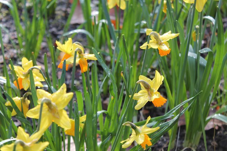Keywords: daffodil daffodils yellow blossom bloom spring flower plant easter green yellow flower garden spring awakening frühlingsanfang drip dew rain the beginning of spring