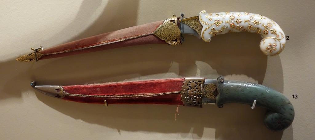 Keywords: Daggers, N. India, Mughal, (top) 19th c., jade hilt inset w. colored stones, velvet-covered wooden sheath, (bottom) early 17th c., jade hilt, watered steel damascened with gold - Huntington Museum of Art - DSC04949.JPG en Exhibit in the Huntington Museum of Art Huntington West Virginia USA Photography was permitted in the museum without restriction This artwork is in the public domain because the artist died more than 70 years ago 2013-05-16 13 51 41 own Daderot cc-zero Uploaded with UploadWizard Weapons in the Huntington Museum of Art Mughal era daggers |